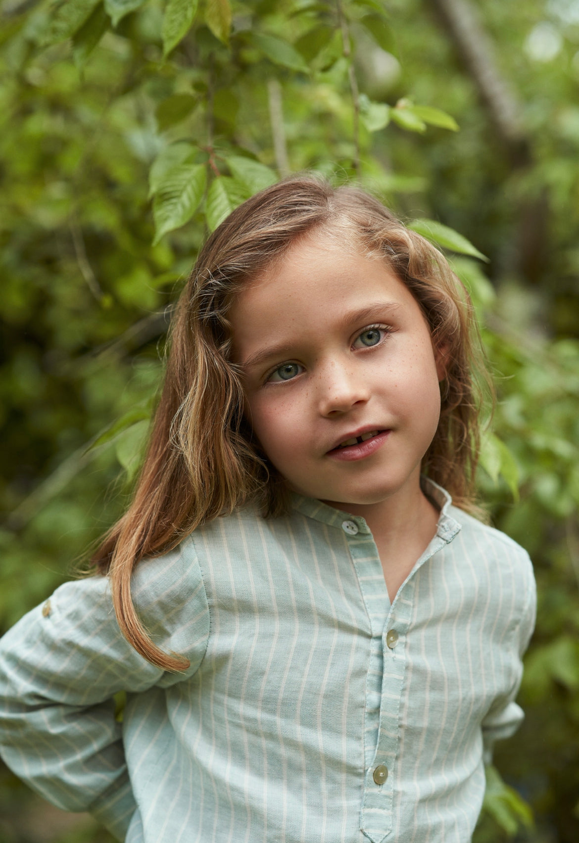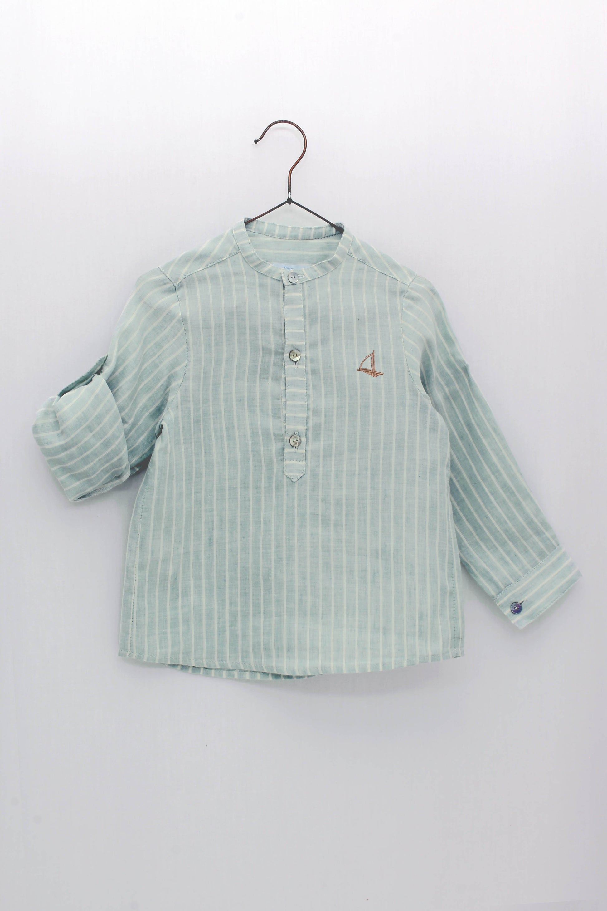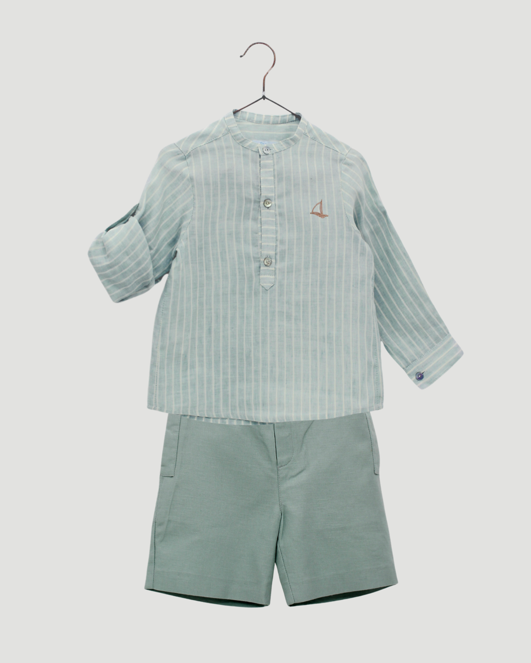 Long-sleeved boy's shirt made of 100% cotton fabric with a mandarin collar, in glacier green with ecru stripes. It has buttons at elbow height so that it can be rolled up. Shorts for boys made of a linen and cotton blend, with side pockets, belt loops and an adjustable waist.