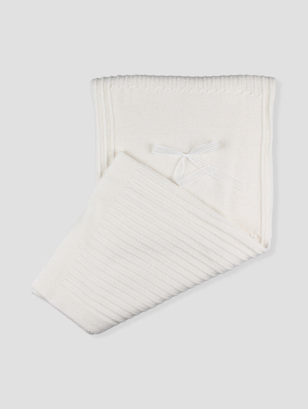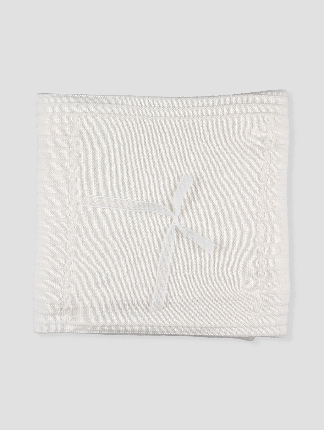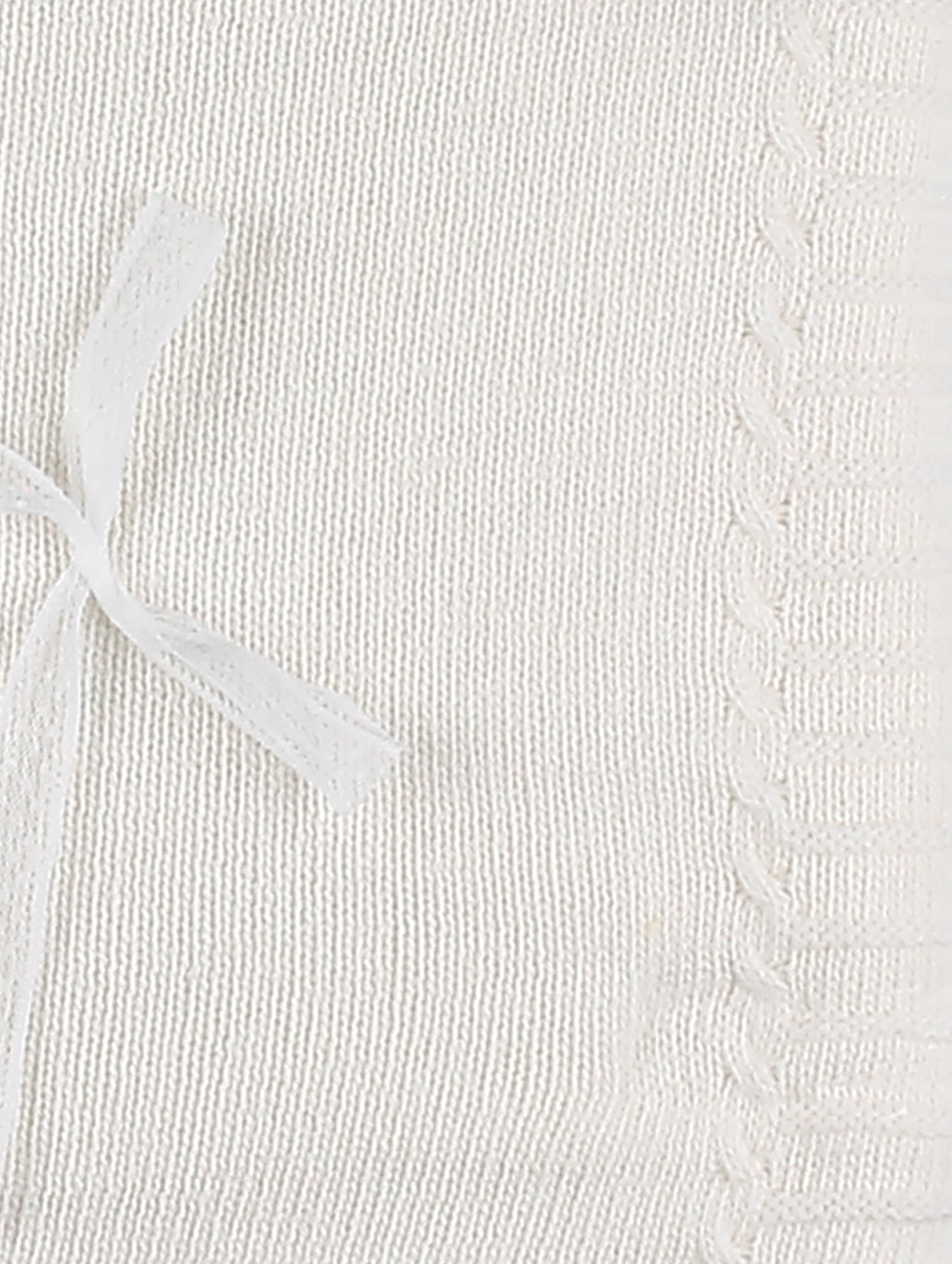 Baby shawl knitted with 100% cotton yarn , ecru tone with Valencian bow detail. Design with cable knit and central motif.