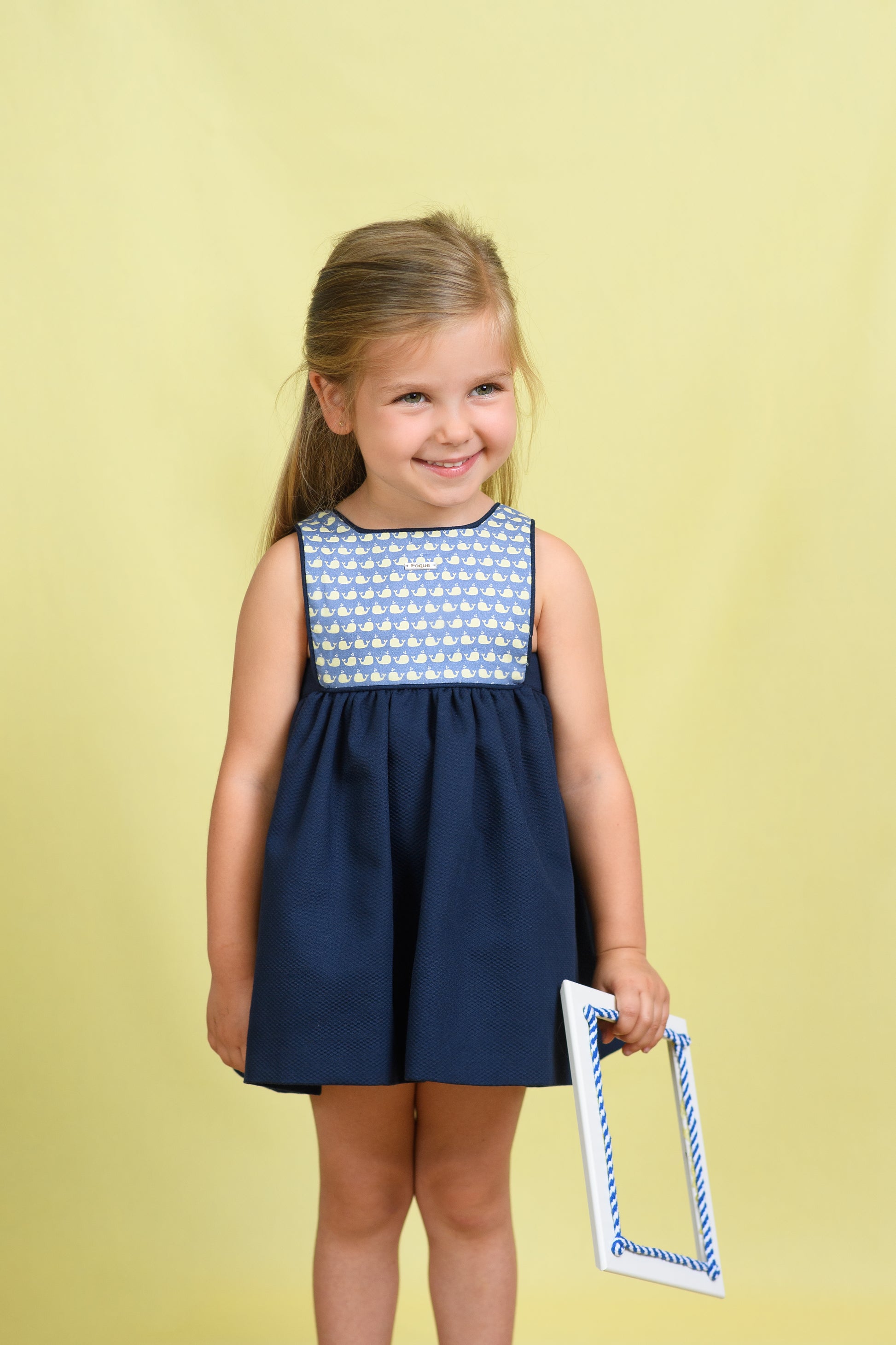 El diseño destaca por su corte amplio con vuelo, que brinda movimiento y comodidad, ideal para acompañar a tu bebé en cualquier ocasión. La pechera en contraste, con un estampado sutil y ribetes en tono oscuro, enmarca la prenda con un acabado refinado.