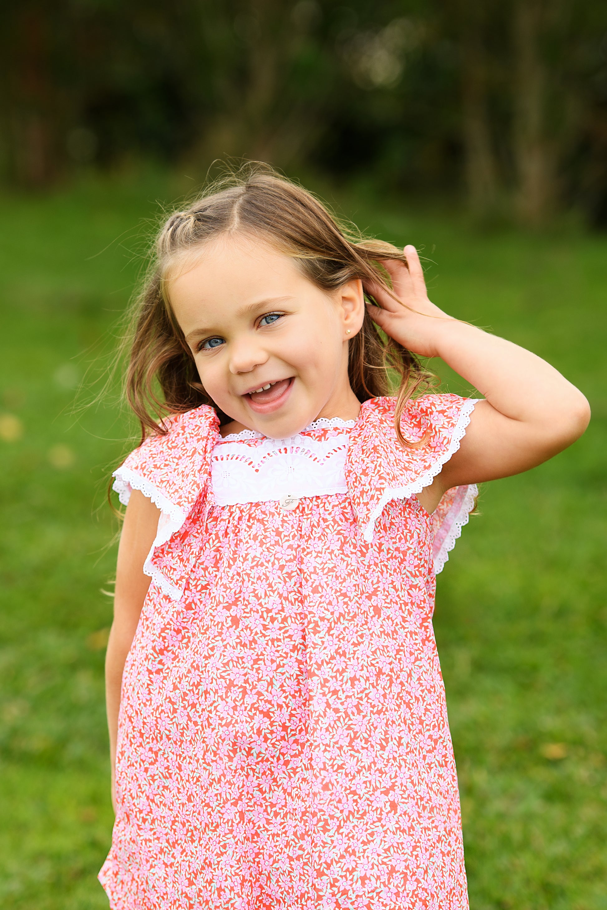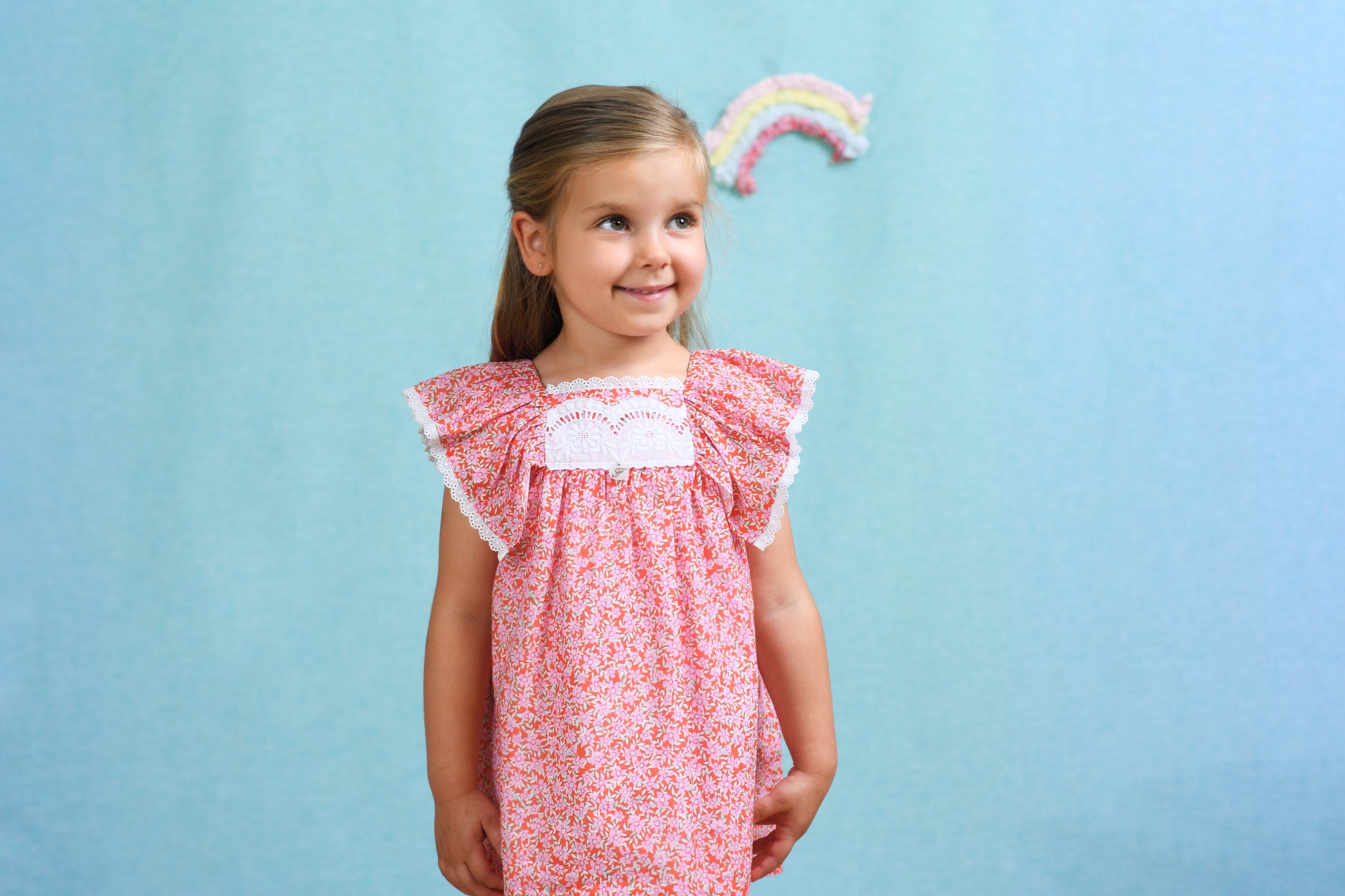 Su estampado floral en tono coral aporta frescura y un aire romántico, mientras que los amplios volantes en los hombros, rematados con puntilla de encaje, enmarcan la prenda con un acabado artesanal y elegante.