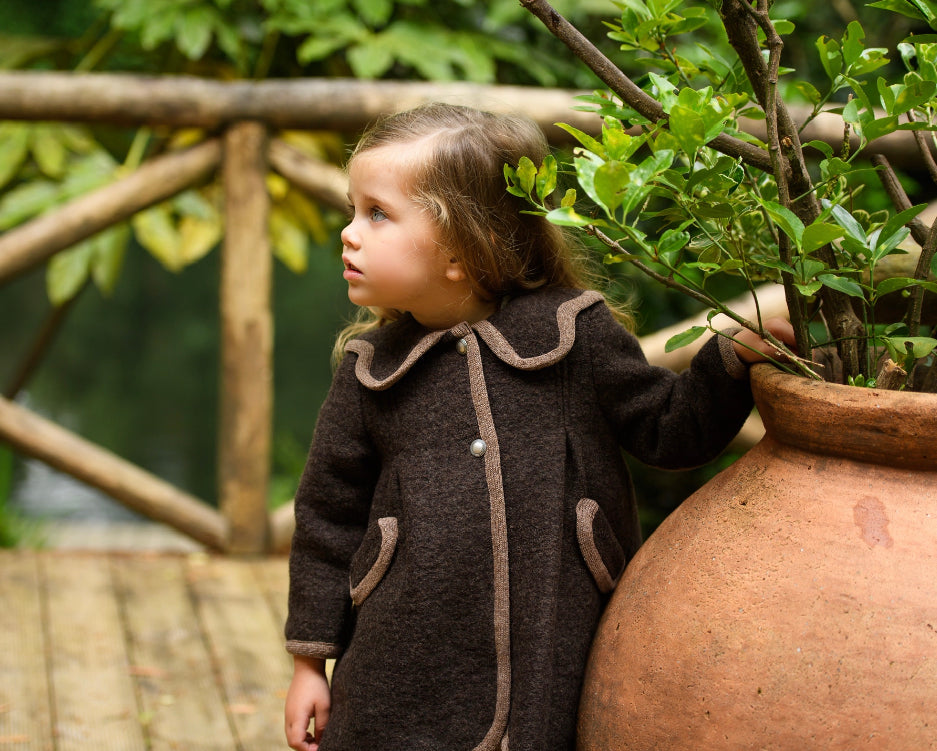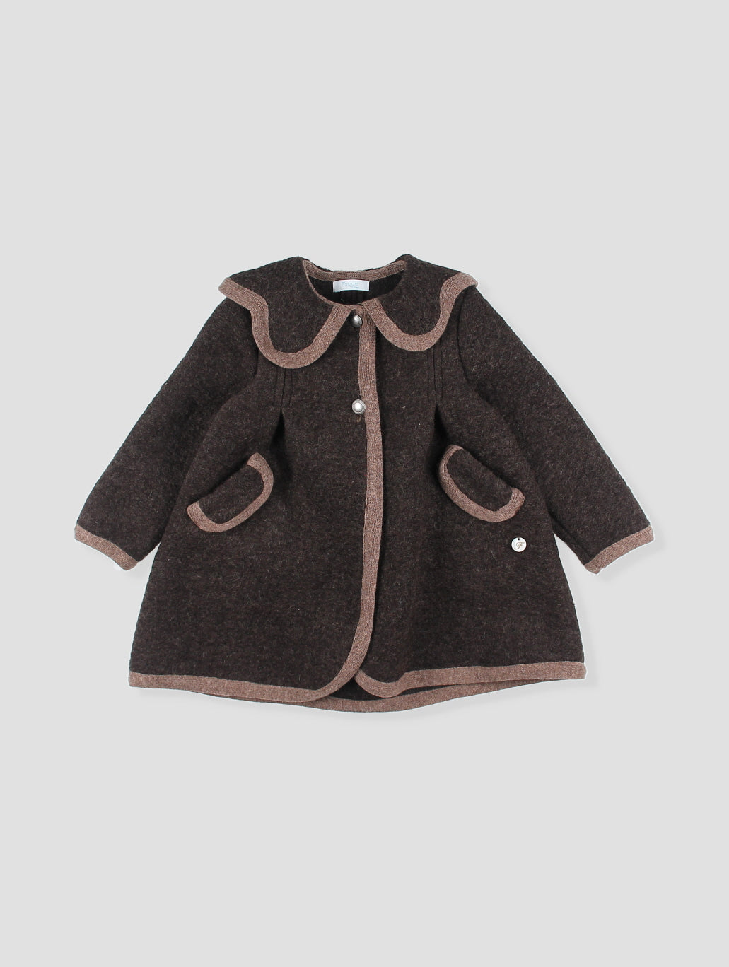 Abrigo de niña con un diseño encantador que destaca por su cuello redondeado y los ribetes a contraste en solapas, bolsillos y bajo. El corte evasé y el cierre con botones joya aportan elegancia y comodidad para los días de frío. Ideal para completar looks de otoño e invierno con un toque clásico y dulce. Disponible en varios colores para adaptarse a diferentes estilos y combinaciones. Una prenda versátil y duradera, perfecta para el día a día o para ocasiones especiales. Hecho en España