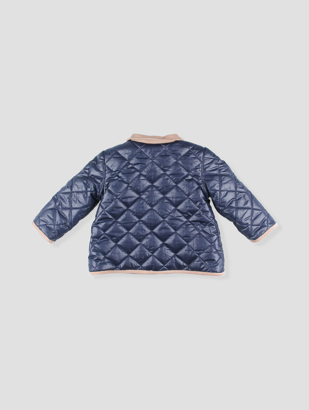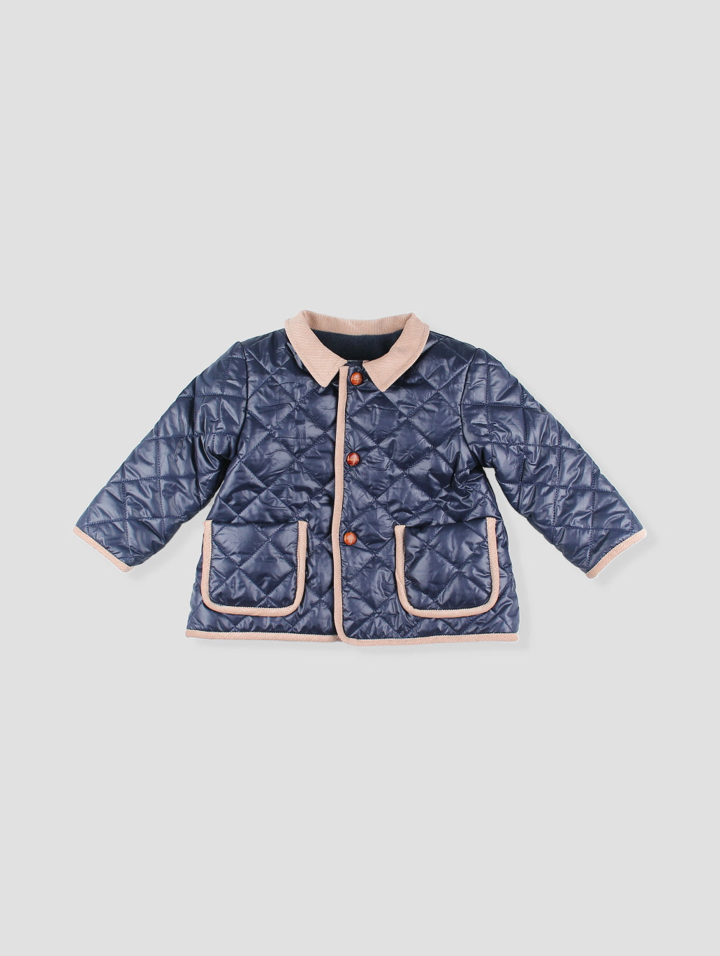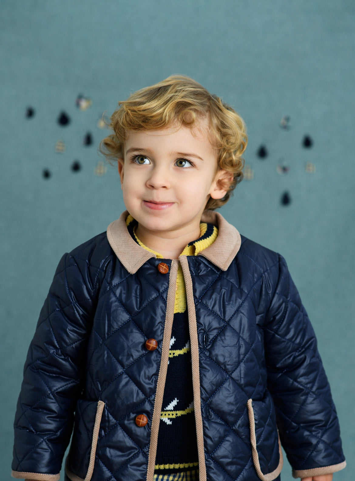 Abrigo acolchado para niño con pespunte en rombos, ideal para los meses más fríos. Presenta un elegante cuello de pana beige y vivos a contraste que realzan el diseño. El cierre frontal con botones de madera y los bolsillos de parche ribeteados completan esta prenda clásica con aire renovado. Perfecto para combinar con los looks de nuestras colecciones Foque y garantizar abrigo sin perder estilo. Un básico cálido y duradero, ideal para el día a día. Hecho en España