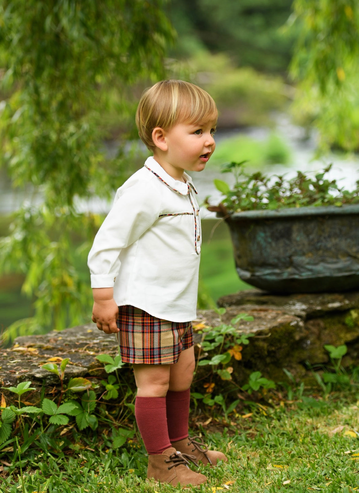 Este conjunto de bebé niño, perteneciente a la colección La Calabaza, combina una camisa blanca con cuello camisero y detalles de vivo a contraste, con un pantalón corto de cuadros en tonos calabaza, burdeos y mostaza. El diseño de la camisa destaca por su tapeta frontal con botones de madera y ribetes que armonizan con el pantalón. Hecho en España