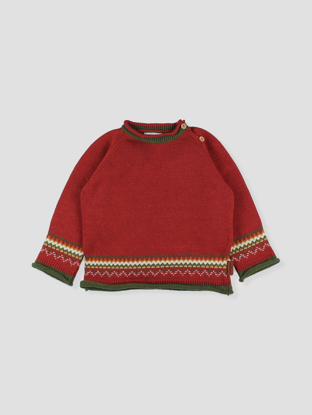 Este encantador jersey de niño, perteneciente a la colección El Viñedo, destaca por su original tono teja y el detalle de greca multicolor en puños y bajo. El cuello caja está rematado en verde con dos botones de madera en el hombro, lo que facilita su puesta. En la imagen del look, se presenta combinado con la ranita de cuadros amarillos y botas de agua, logrando un estilismo tan otoñal como divertido. Ideal para aportar calidez y color en los días frescos. Hecho en España