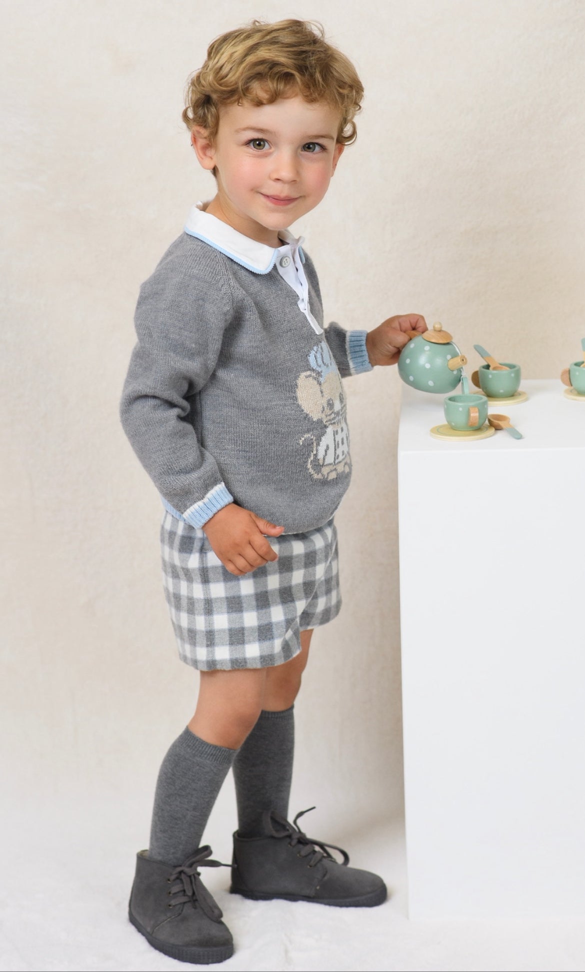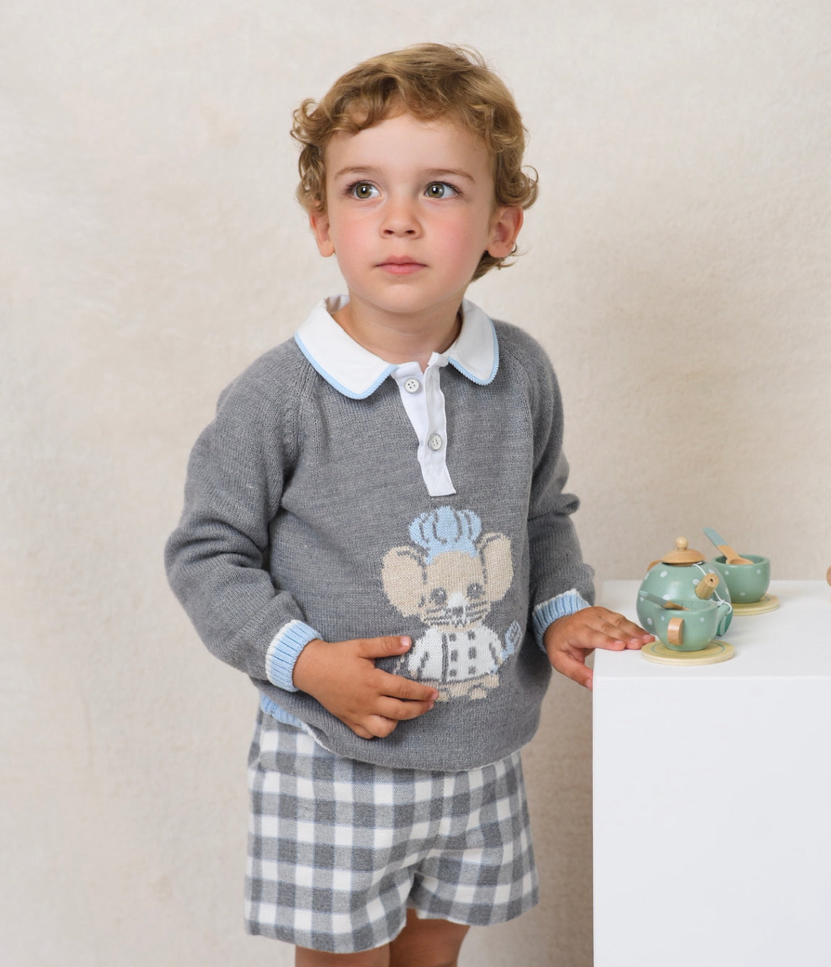 Jersey de punto gris para niño con cuello camisero blanco y ribete celeste, adornado con un simpático dibujo de ratón cocinero tejido en intarsia, diseño exclusivo de Foque. Se combina con un short de cuadros en tonos grises, creando un look actual, dulce y divertido, perfecto para el día a día o para una ocasión especial. Hecho en España.