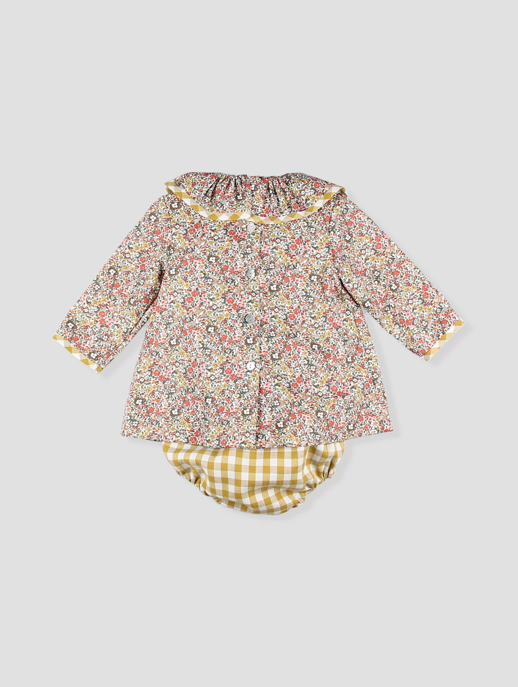 Este encantador jesusito para bebé niña combina el romanticismo del estampado floral con la energía del vichy mostaza. Destaca el gran cuello volante con ribete en contraste y la pechera bordada con delicadeza artesanal. La braguita a juego completa el conjunto, pensado para lucir en días especiales de otoño o invierno. Su diseño cómodo y alegre lo convierte en una elección ideal para regalos o celebraciones. Pertenece a la colección El Viñedo. Hecho en España.