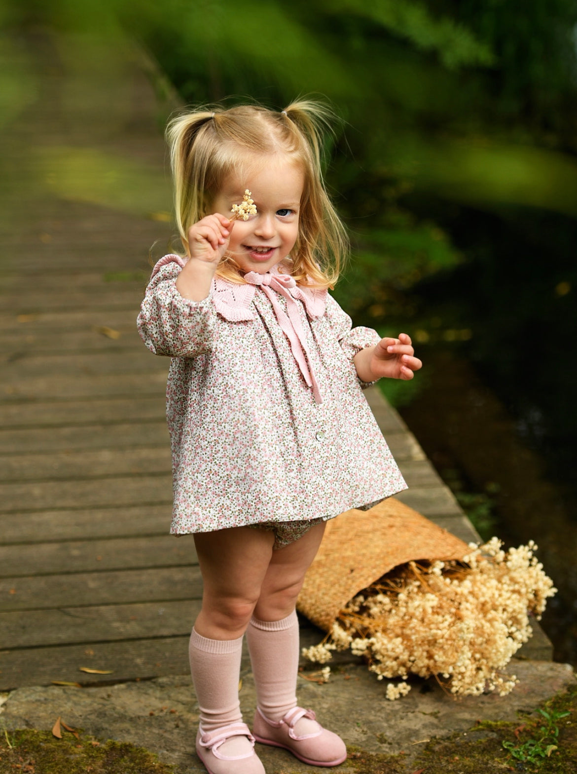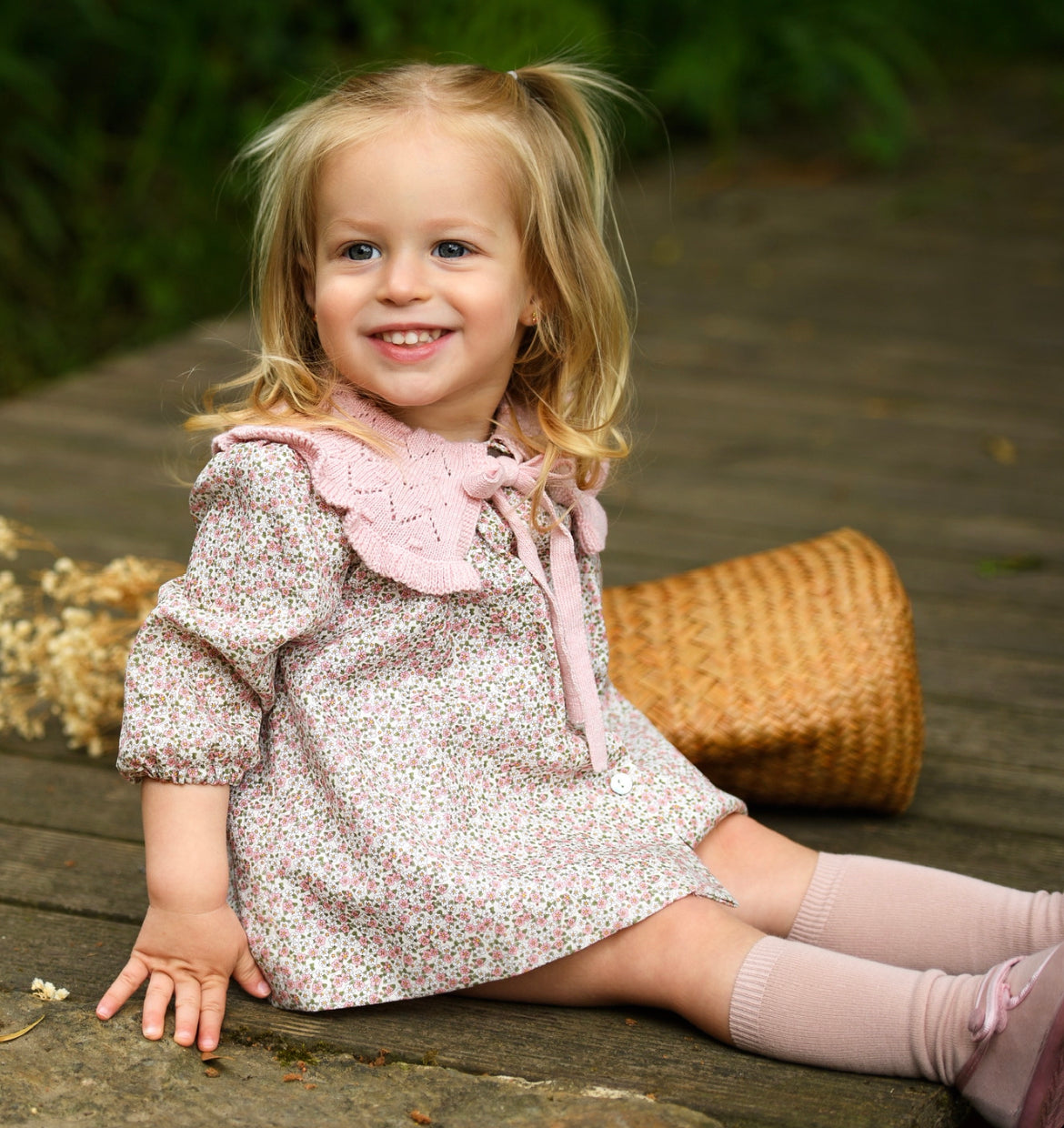 Este jesusito para bebé niña destaca por su dulce estampado floral en tonos empolvados y el gran cuello de punto rosa con calados y lazo. Incluye manga larga fruncida y braguita a juego. Pertenece a la colección Ladera y puede completarse con la capota de punto rosa para un total look ideal. Perfecto para vestir en los días especiales de otoño e invierno. Hecho en España