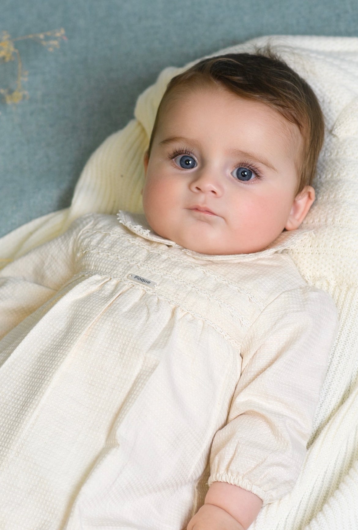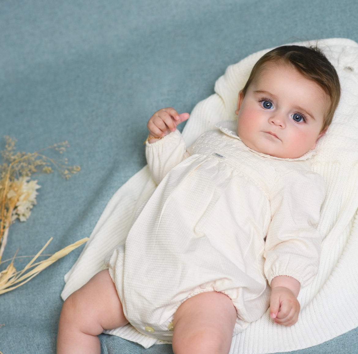Este pelele unisex para bebé combina delicadeza y elegancia en una prenda perfecta para las primeras puestas. Destaca el cuello bebé con puntilla a tono y el canesú fruncido con detalles cuidados que aportan dulzura al diseño. Las mangas abullonadas con puño elástico y el cierre trasero con botones aseguran un ajuste cómodo y fácil de poner. Hecho en España.
