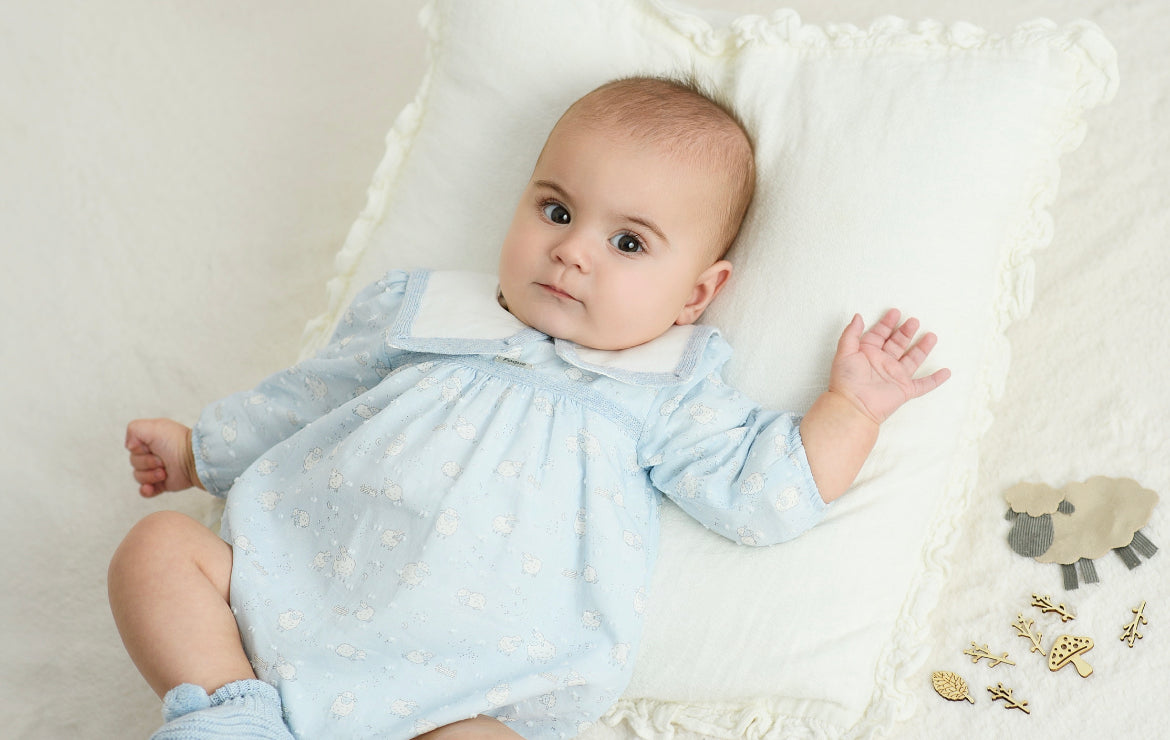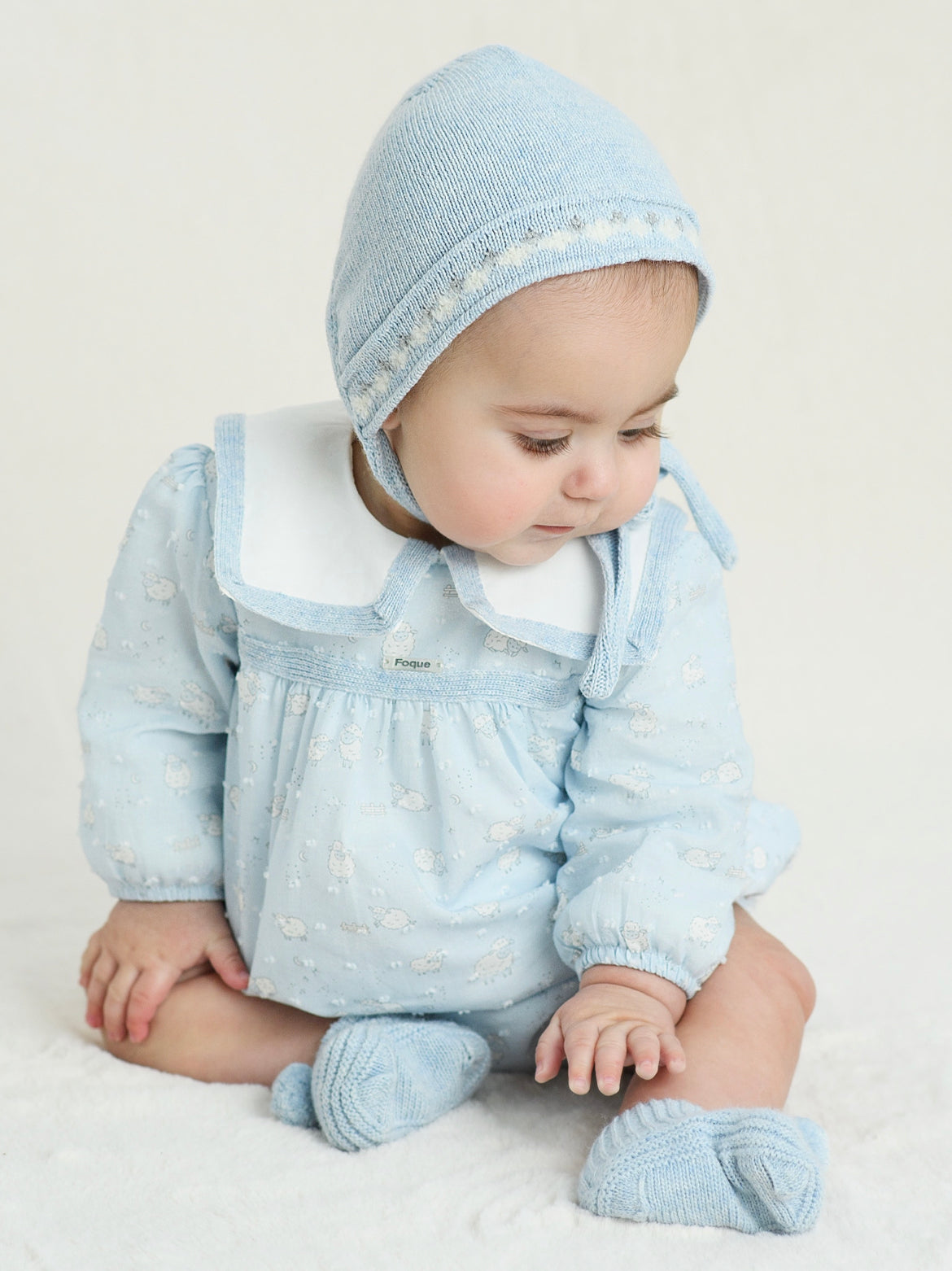 Pelele de bebé niño en azul con un simpático estampado de borreguitos, perfecto para vestir con gracia en los días frescos. Su cuello color crema aporta calidez y un bonito contraste. Las mangas largas y la espalda abotonada facilitan el cambio sin renunciar al estilo. Una prenda cómoda y con mucho encanto, ideal para regalar o disfrutar en el día a día. Hecho en España