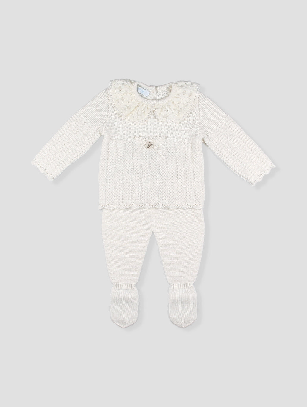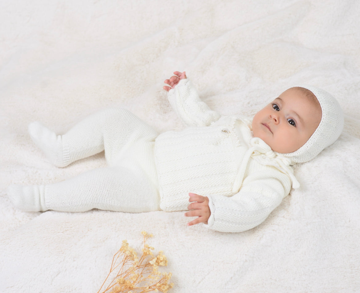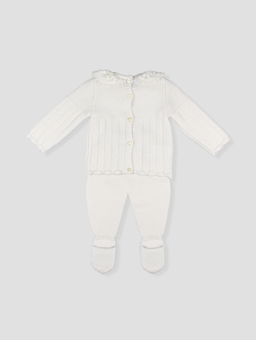 Este conjunto de para bebé en delicado tono crudo está pensado para envolver a los más pequeños en suavidad y elegancia. El jersey presenta un cuidado punto trabajado con detalles en relieve y un exquisito cuello de puntilla, mientras que la polaina a juego garantiza abrigo y libertad de movimiento. Cierre trasero con botones para vestir con facilidad. Perfecto para ocasiones especiales o salidas cotidianas con estilo. Destaca la chapa nacarada corporativa FOQUE como sello de calidad y diseño.