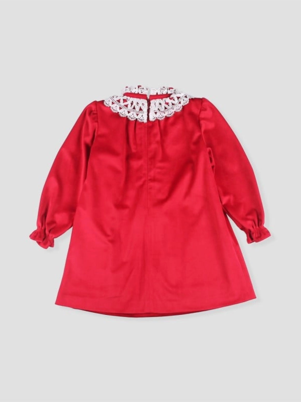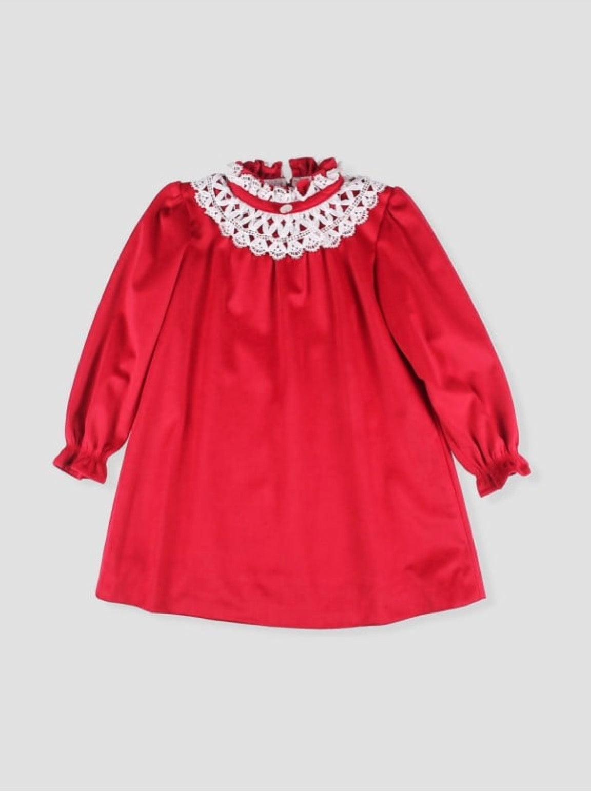 Este vestido de terciopelo para niña es pura elegancia. De corte recto y confeccionado en un tejido suave y cálido, destaca por su espectacular cuello redondo adornado con delicada puntilla blanca y un volante fruncido que enmarca el escote. Las mangas largas terminan en puños con elásticos y pequeños volantes, aportando un aire romántico y refinado. Es perfecto para celebraciones, Navidad o momentos inolvidables en familia. Hecho en España