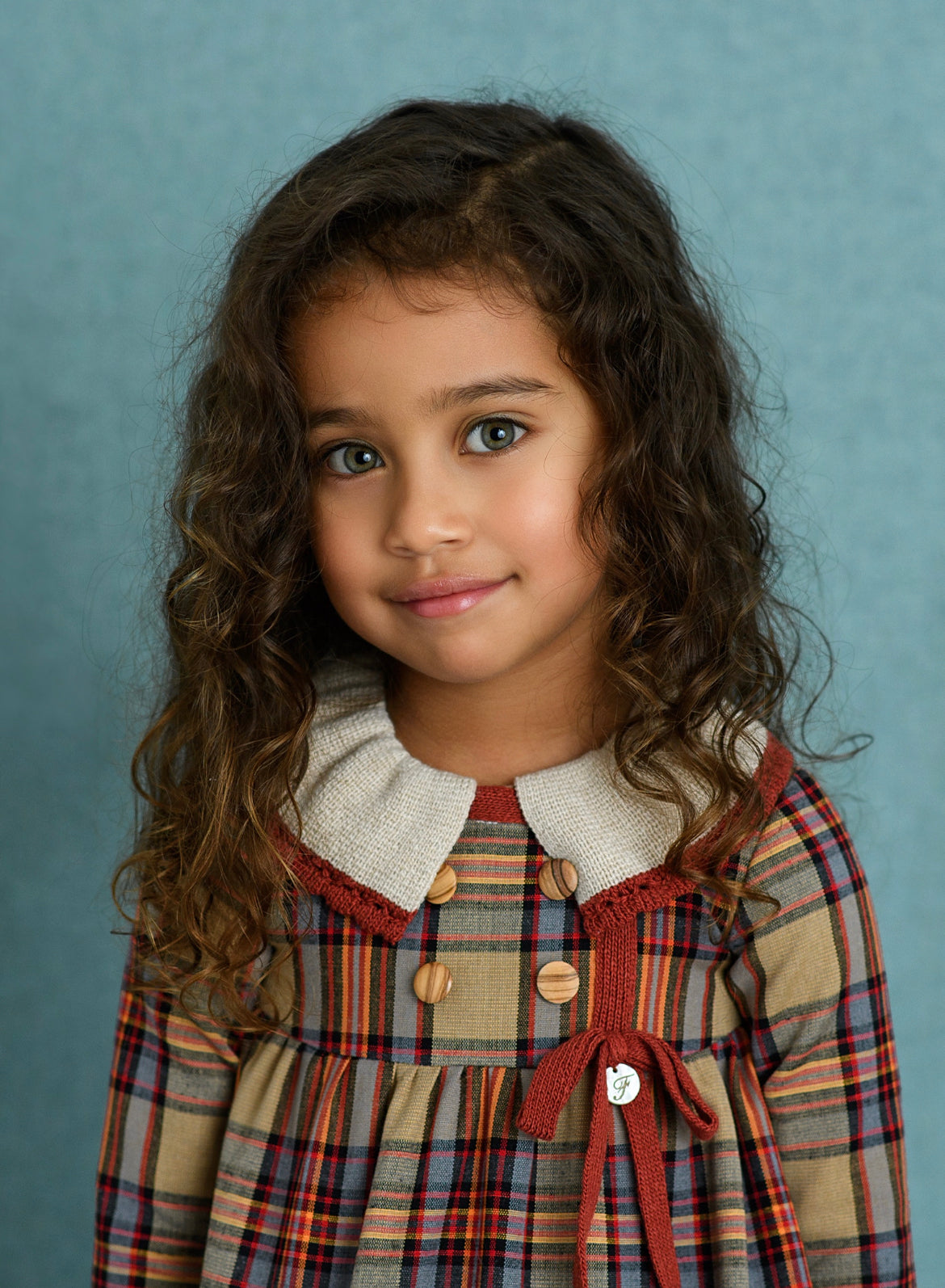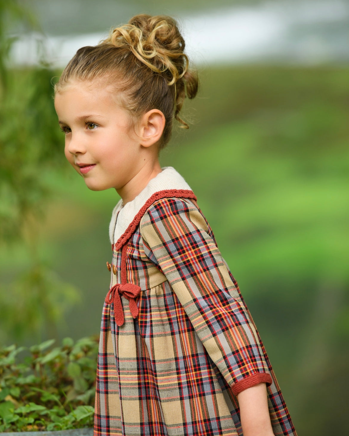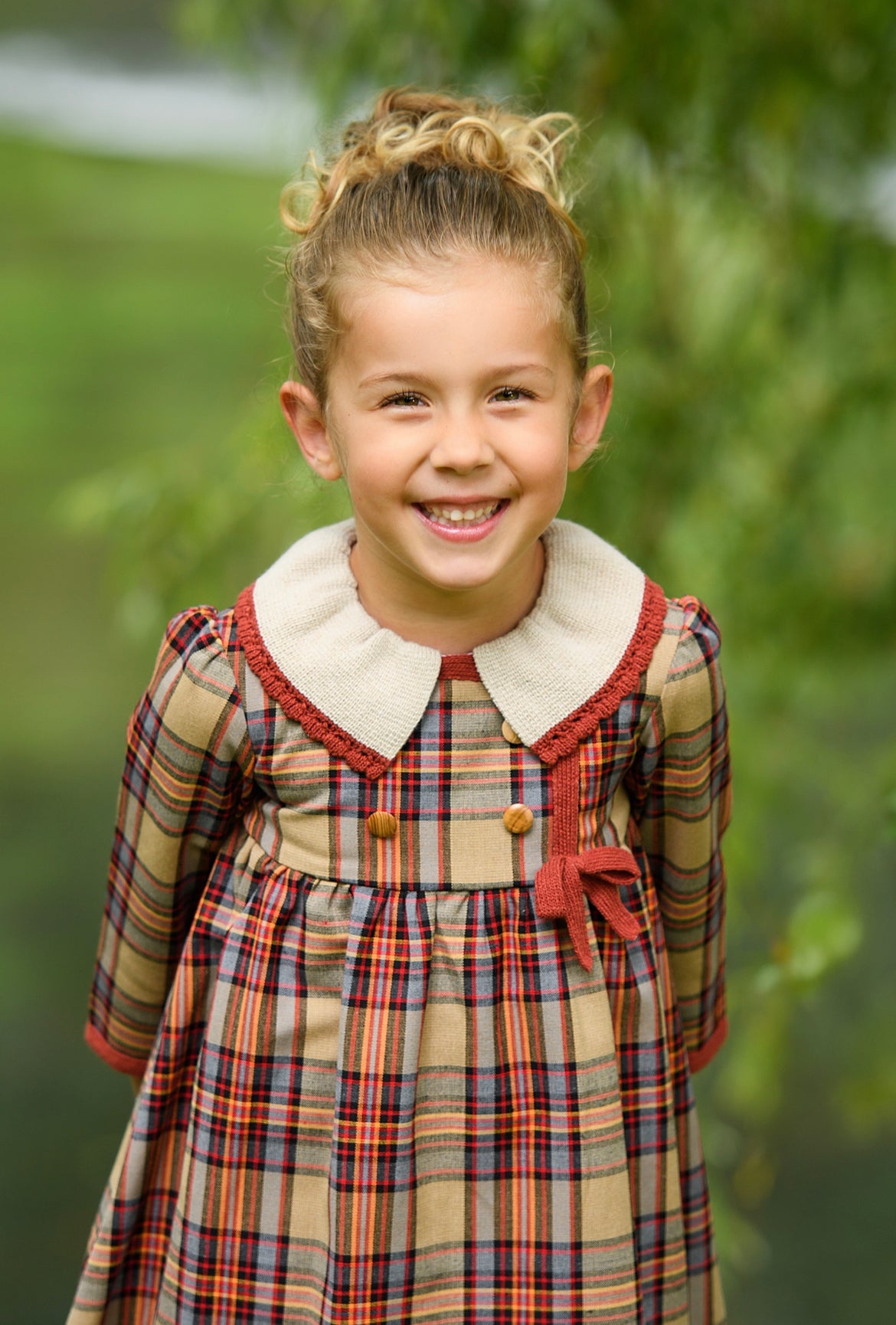 Este vestido para niña es uno de los más especiales de esta temporada, de corte clásico con tejido de cuadros en tonos tostados, teja y burdeos, ideal para la temporada otoñal. El cuello de punto crudo con vivo a contraste y los botones de madera decorativos en el delantero aportan calidez y encanto al diseño. El lazo de canalé en color teja a un lado añade un toque distintivo. Hecho en España.