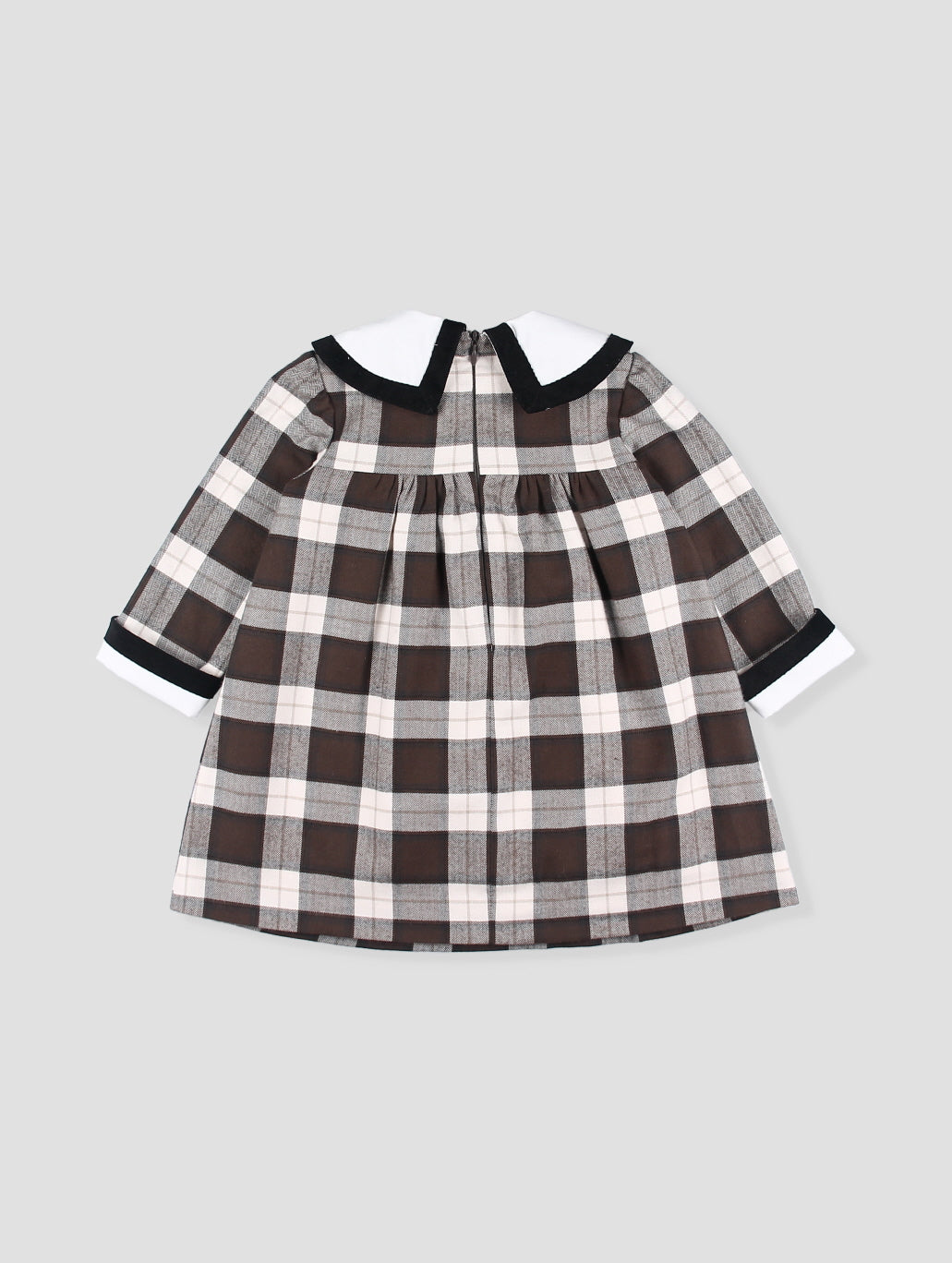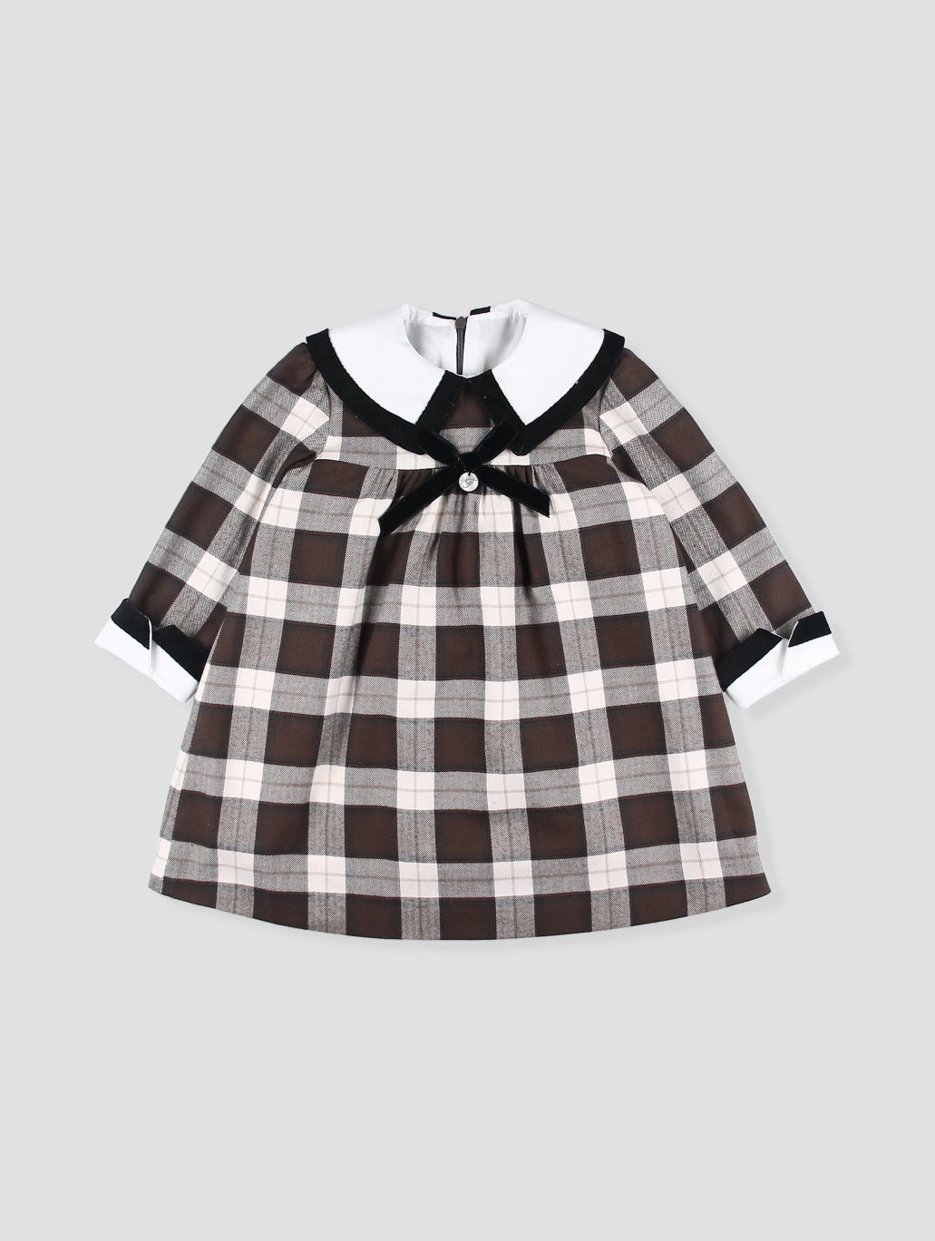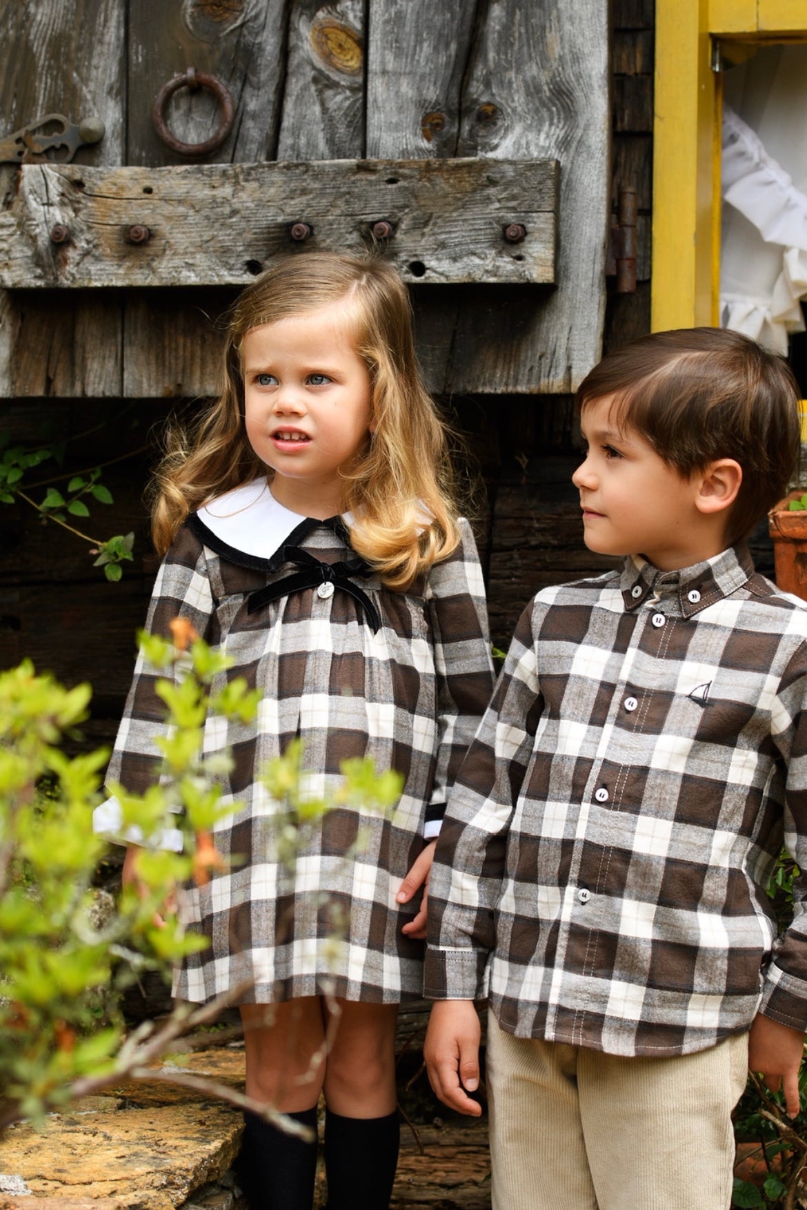 Este vestido para niña destaca por su original diseño de cuadros grandes en tonos marrón. El maxicuello en color blanco con vivo negro aporta un toque elegante y de luz, mientras que el lazo de terciopelo en el pecho añade un aire sofisticado. Los puños blancos con vuelta negra rematan el diseño con delicadeza. Ideal para vestir en eventos otoñales o para el día a día con estilo. Hecho en España