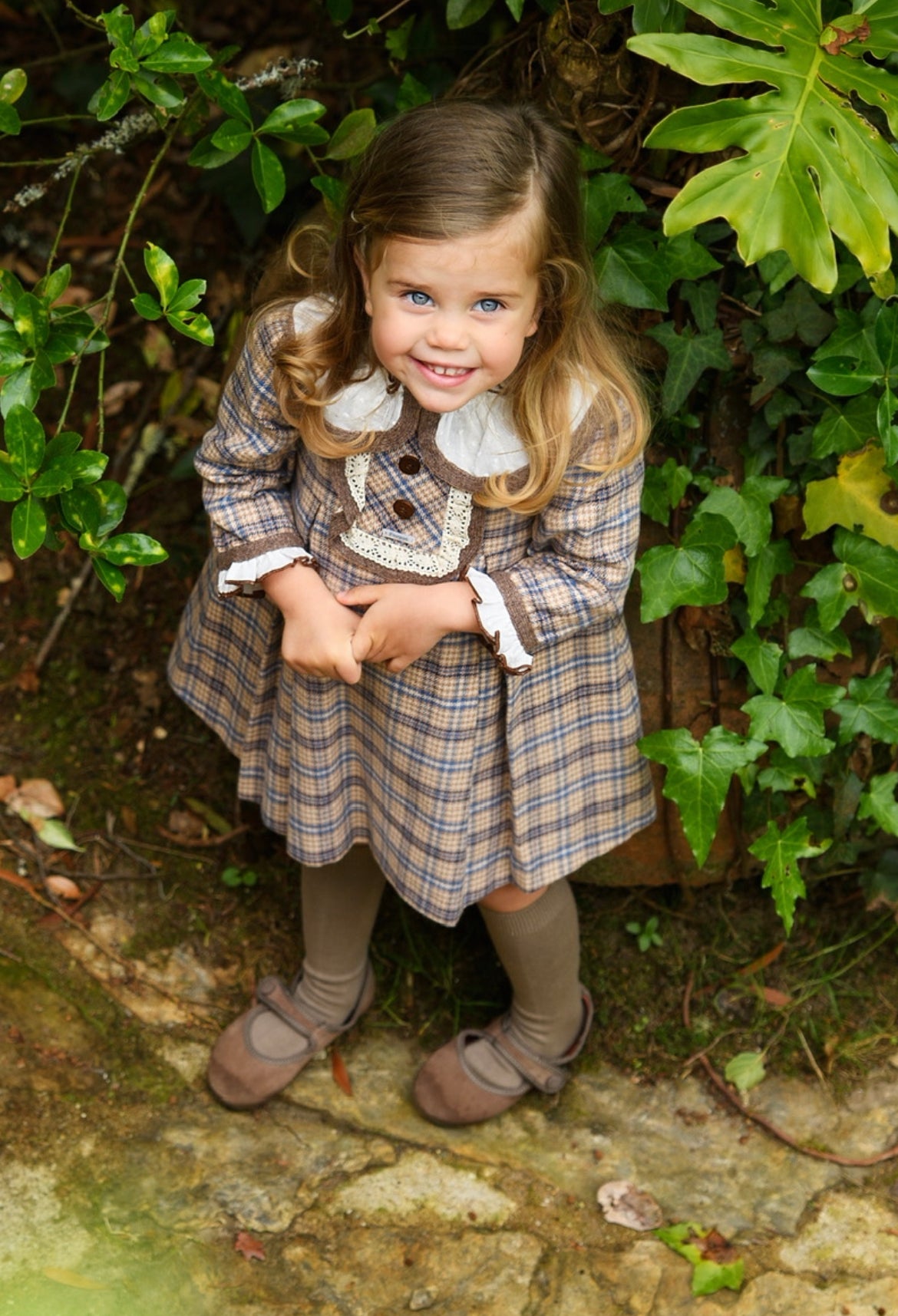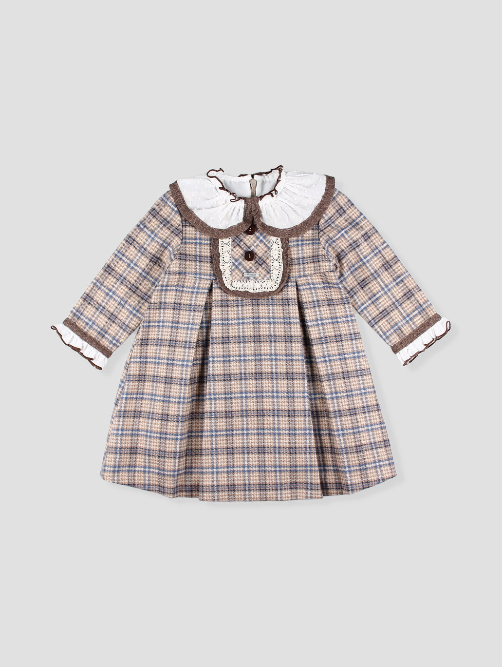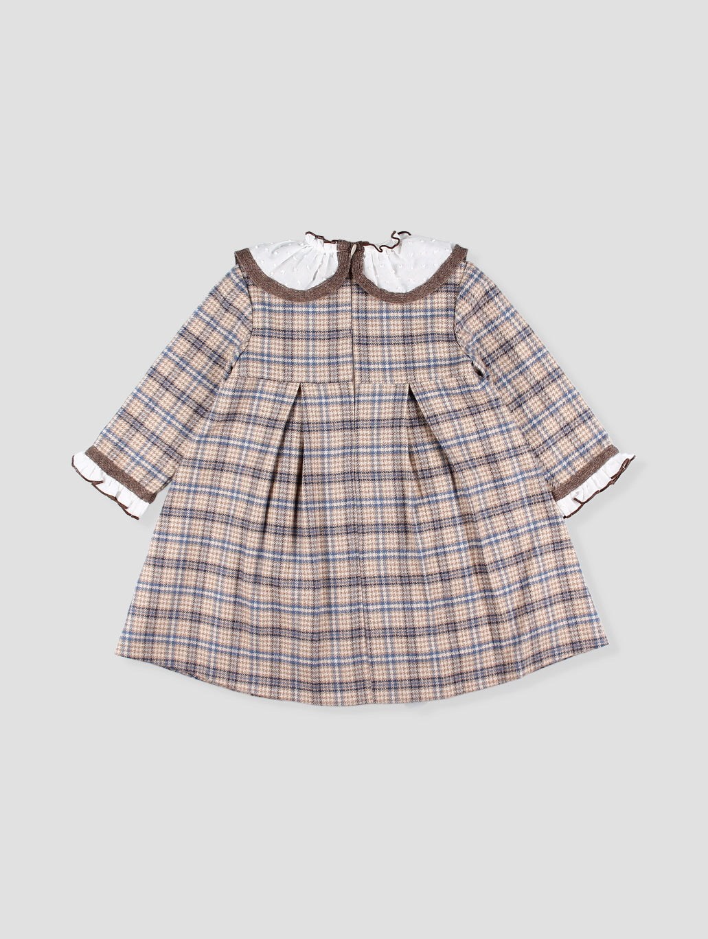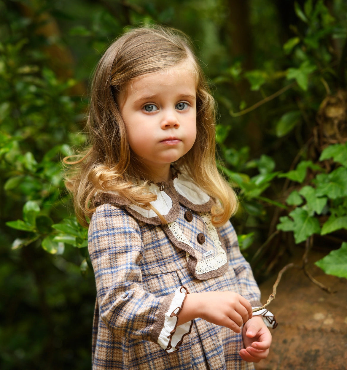 Este vestido para niña es una joya de inspiración clásica, confeccionado en tejido de cuadros tostados con pinceladas azules. El cuello volante de plumeti, fruncido y con remate de punto, aporta exclusividad en el diseño. La pechera central con rucher se decora con botones de madera y entredós beige, a juego con los detalles de las mangas. Ideal para ocasiones especiales, sesiones de fotos o celebraciones otoñales. Hecho en España