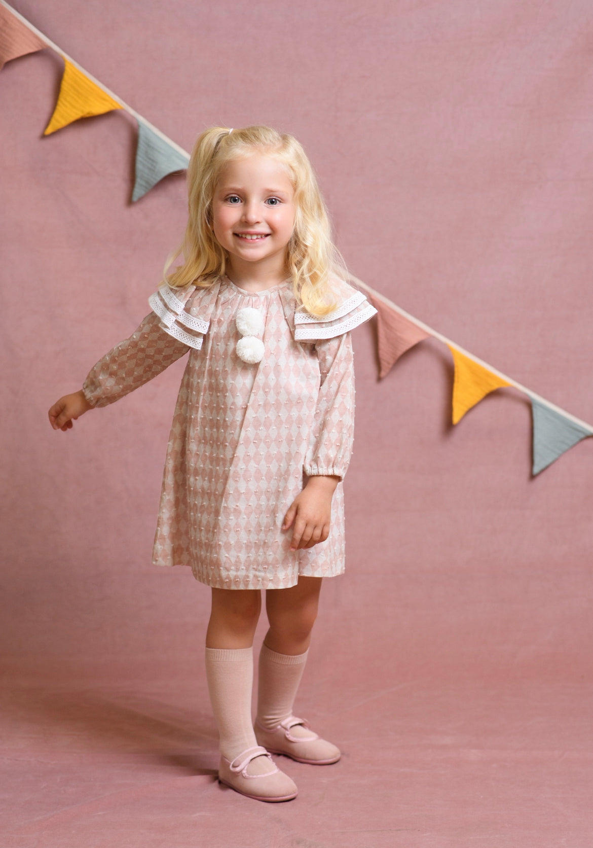 Este vestido de niña de la colección El Circo enamora por su estampado de rombos irisados y sus detalles llenos de encanto. El diseño destaca por el cuello con doble volante y entredós, y por los dos pompones decorativos en el delantero. Las mangas largas con puño fruncido aportan comodidad y libertad de movimiento. Hecho en España
