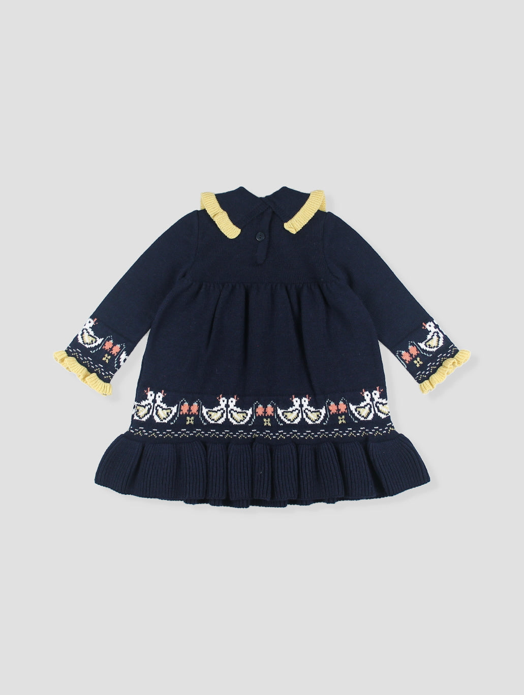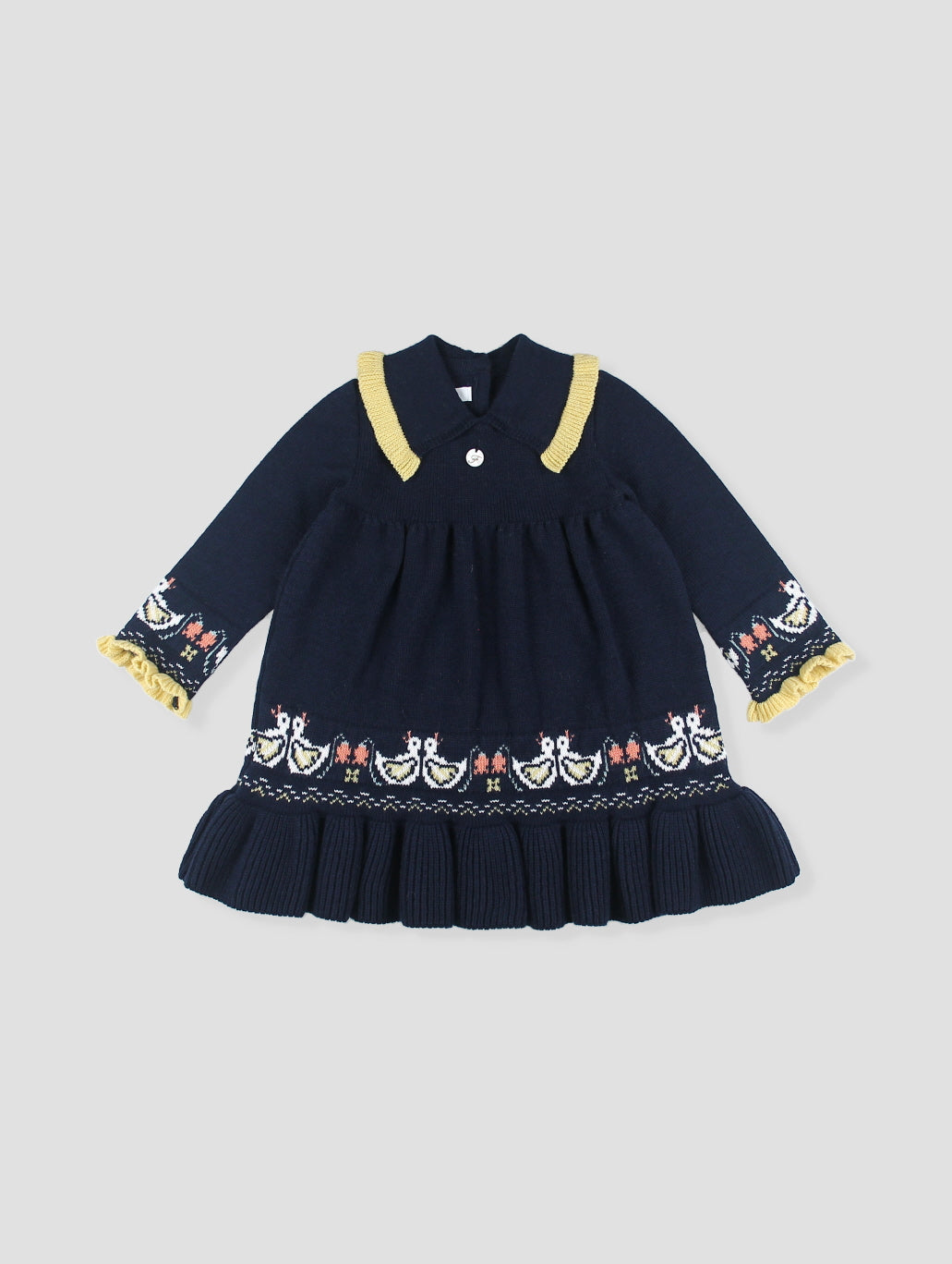 Vestido para niña confeccionado en punto bicolor mostaza y azul marino. Es ideal para el día a día o para ocasiones más especiales durante el entretiempo. Una propuesta dulce y atemporal. Hecho en España